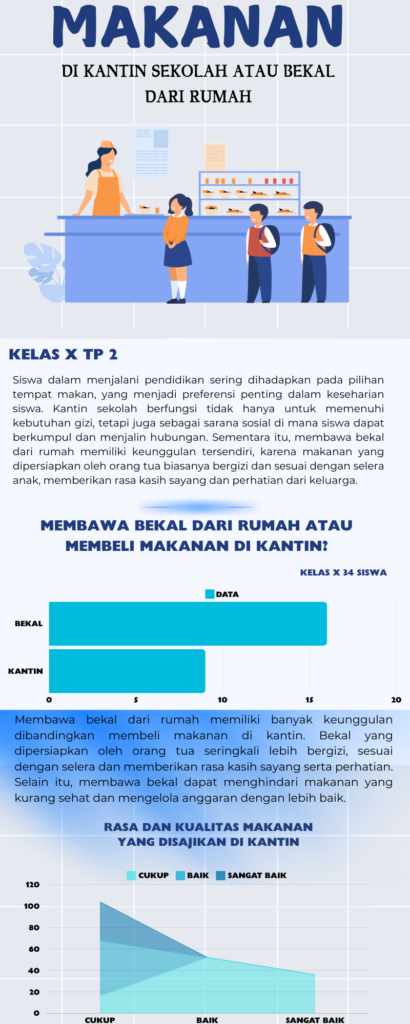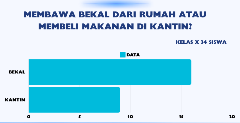 Setiap hari, siswa di sekolah memilih antara membawa bekal dari rumah atau makan di kantin. Mereka yang membawa bekal biasanya menikmati hidangan buatan rumah yang lebih sehat dan berkumpul bersama di taman. Sementara itu, yang makan di kantin senang dengan berbagai pilihan menu dan kepraktisannya. Terlepas dari pilihan mereka, waktu makan menjadi momen berharga untuk bersantai dan berbagi cerita bersama teman-teman. Berikut hasil survey kelas X.TP Membawa bekal dari rumah atau membeli makan di kantin ?