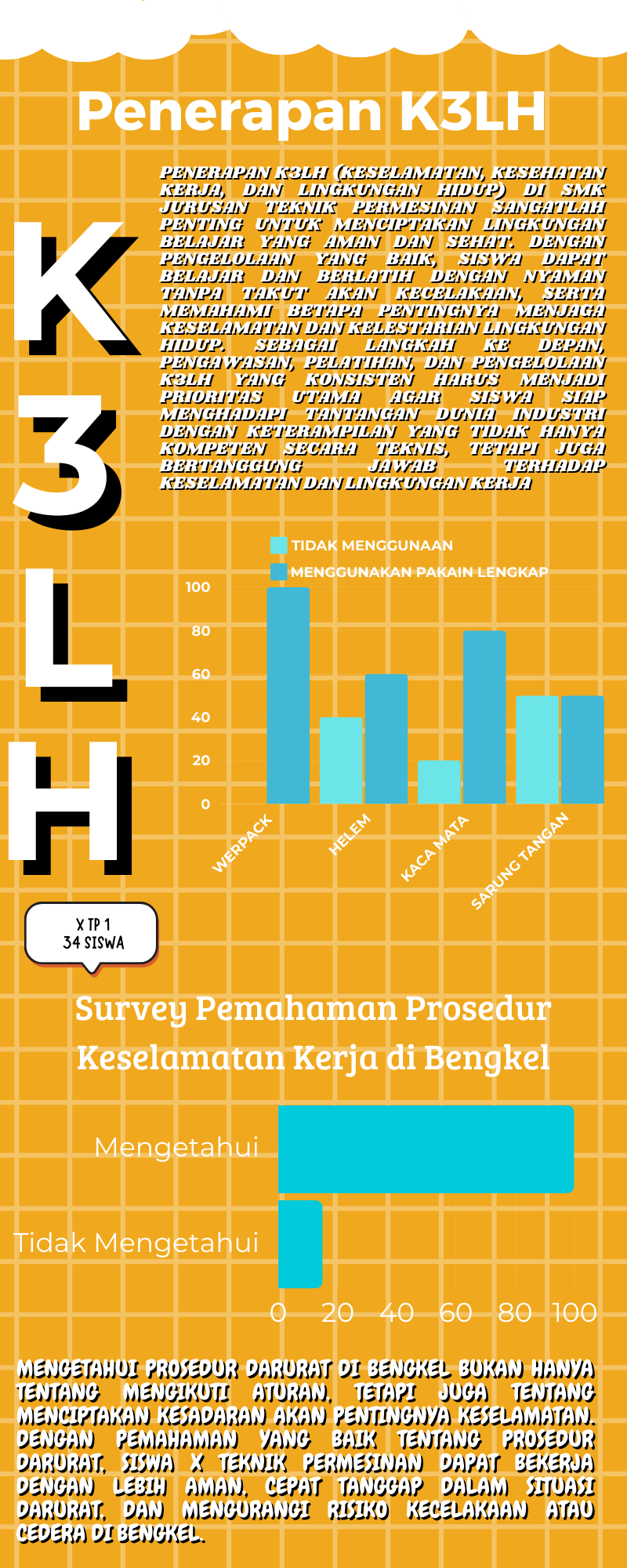 Penerapan K3LH (Keselamatan, Kesehatan Kerja, dan Lingkungan Hidup) di SMK Jurusan Teknik Permesinan sangatlah penting untuk menciptakan lingkungan belajar yang aman dan sehat. Dengan pengelolaan yang baik, siswa dapat belajar dan berlatih dengan nyaman tanpa takut akan kecelakaan, serta memahami betapa pentingnya menjaga keselamatan dan kelestarian lingkungan hidup. Sebagai langkah ke depan, pengawasan, pelatihan, dan pengelolaan K3LH yang konsisten harus menjadi prioritas utama agar siswa siap menghadapi tantangan dunia industri dengan keterampilan yang tidak hanya kompeten secara teknis, tetapi juga bertanggung jawab terhadap keselamatan dan lingkungan kerjA